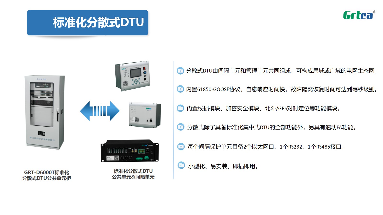 GRT-D6000F标准化分散式DTU可与配电网自动化主站和子站系统配合,也可自主分布式组网,实现多条线路的电量的采集和控制,检测故障、故障区域定位、隔离及非故障区域恢复供电,提高供电可靠性。